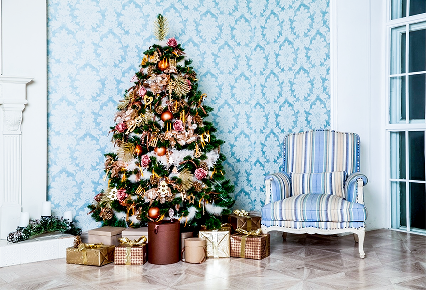 Toile de fond de photographie de festival de Noël de sofa de mur bleu