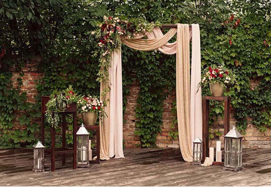 Toile de fond de rideau de dentelle blanche de mariage feuilles vertes pour la photographie de cérémonie de mariage